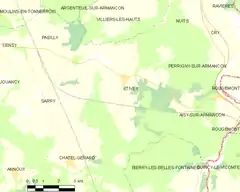 - Situación de Étivey en un mapa de Francia y de comunas limítrofes (en francés)