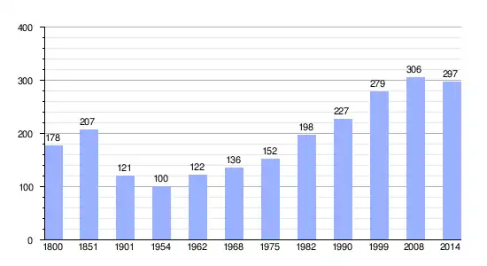 Los datos demográficos contemplados en este gráfico de la comuna de Étouvy[4] se han cogido de 1800 a 1999 de la página francesa EHESS/Cassini, y los demás datos de la página del INSEE.[5]