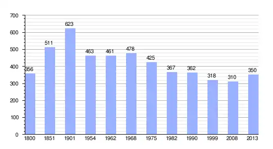 Los datos demográficos contemplados en este gráfico de la comuna de Étusson[4] se han cogido de 1800 a 1999 de la página francesa EHESS/Cassini, y los demás datos de la página del INSEE.[5]