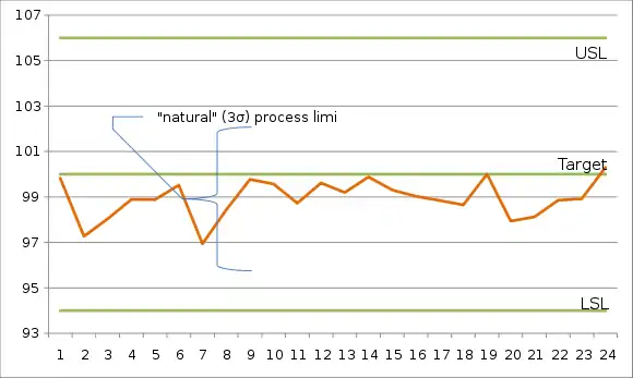 Considere una característica de calidad con un objetivo de 100.00 μm y límites de especificación superior e inferior de 106.00 μm y 94 μm respectivamente. Si después de supervisar el proceso cuidadosamente por un rato, parece que el proceso está bajo control y produce salidas con previsibilidad (como se muestra en el gráfico de ejecución de abajo), podemos estimar significativamente su media y desviación estándar.