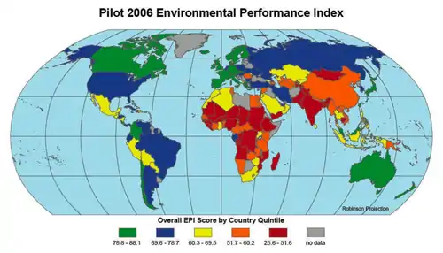 2. Yale Center for Environmental Law & Policy and Center for International Earth Science Information Network at Columbia University. «Pilot 2006 Environmental Performance Index Main Report» (en inglés). p. 33. Archivado desde el original el 5 de enero de 2007. Consultado el 17 de junio de 2007.