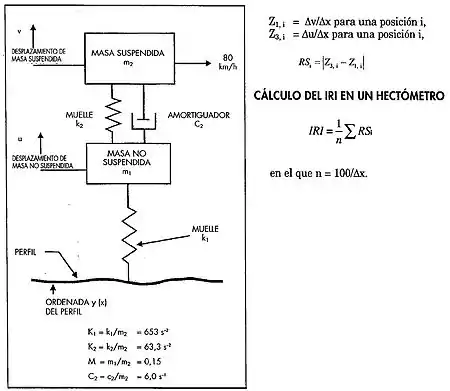 Para confeccionar la definición del IRI, los expertos del Banco Mundial crearon, en los años 80, un modelo denominado “cuarto de coche” o “Quarter Car”, que simulaba la 4ª parte de un coche, y que constaba de los siguientes parámetros para la definición del IRI: