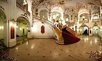 Tres entradas principales y dos laterales conducen al interior de la ópera. El magnífico hall de entrada está lleno de luz, con una escalera principal central y dos pasillos laterales separados. El pasillo de la escalera es el central, combinándose con las dos escaleras laterales diponiendo de un espacio grande.[13]