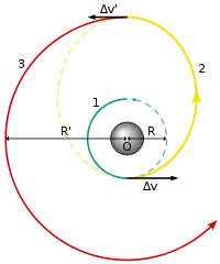 La órbita de transferencia de Hohmann es una mitad de una órbita elíptica que toca tanto la órbita inicial que se desea dejar (en verde en el diagrama) como la órbita final que se quiere alcanzar (en rojo en el diagrama). La órbita de transferencia (en amarillo en el diagrama) se inicia disparando el motor de la nave espacial para acelerarla creando una órbita elíptica; esto añade energía a la órbita de la nave espacial. Cuando la nave alcanza la órbita final, su velocidad orbital debe ser incrementada de nuevo para hacer una nueva órbita circular; el motor acelera de nuevo para alcanzar la velocidad necesaria.[1]