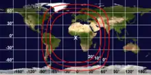 Órbita geosíncrona no geoestacionaria. Semieje mayor = 42165 km. Excentricidad = 0º(circular). Inclinación = 45º