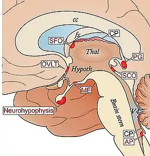 Ubicación de los NHO/CVO en el cerebro humano.Imagen sagital de RMN. En rojo los CVO sensoriales; en azul los secretores. * NH: neurohipófisis * AP: área postrema. * ME:Eminencia media. * PG:Glándula pineal * SFO:Órgano subfortcial. *OVLT:Órgano vasculoso de la lamina terminalis.[1]
