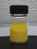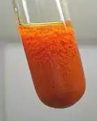 A diferencia de la mayoría de los óxidos metálicos, se disuelve ligeramente en agua para dar una solución ácida de color amarillo pálido. Cuando este compuesto se forma por precipitación de la solución acuosa, a continuación, su color es naranja intenso en lugar de marrón / amarillo.