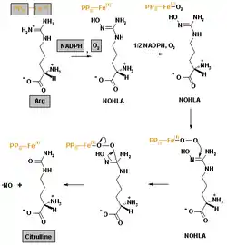 La oxidación de L-Arg a L-citrulina ocurre vía dos sucesivas reacciones de monooxigenación, produciendo Nω-hidroxi-L-arginina (NOHLA) como intermediario. Dos moles de O