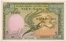 En 1953 el Instituto de Emisión de los Estados de Camboya, Laos y Vietnam introdujo billetes fechados en 1952 en denominaciones de 1, 5, 10, 100 y 200 dong. En 1955 el Banco Nacional de Vietnam (Ngân-Hâng Quôc-Gia Viêt-Nam) asumió las competencias para emitir dinero e introdujo billetes en denominaciones de 2 y 500 dong, y al año siguiente de 20 y 50 dong. Entre 1964 y 1968, los billetes inferiores a 50 dong se sustituyeron por monedas. En 1971, se introdujeron billetes de 1.000 dong. Debido a la inflación, se añadieron denominaciones de 5.000 y 10.000 dong impresos en 1975, pero que no llegaron a circular debido al cambio del régimen.