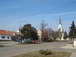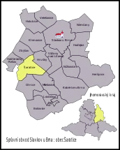 Se encuentra ubicada al este de la región, cerca de la orilla del río Morava —un afluente izquierdo del Danubio—, de la frontera con las regiones de Zlín y Moravia-Silesia, y a poca distancia al este de la ciudad de Brno.[1]