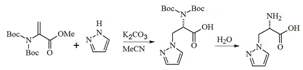 Ferreira y colaboradores establecieron una síntesis de β-Pirazol-1-ilalanina por adición de Michael del pirazol sobre el 2-[bis(ter-butoxicarbonil)amino]prop-2-enoato de metilo.[4]