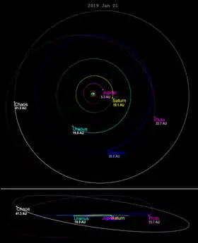 ![]() La órbita de 19521 Chaos (blanco) comparó a Plutón y los cuatro planetas gigantes: Júpiter, Saturno, Urano y Neptuno con posiciones para 2019. | ||