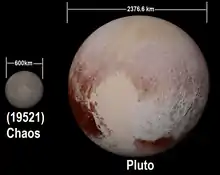 19521 Chaos es un cubewano, objeto del cinturón de Kuiper en sin estar resonancia con ningún planeta. Es un probable planeta enano. Chaos fue descubierto en 1998 por el Deep Ecliptic Survey con el telescopio de 4 m Kitt Peak's. Su albedo es de 0.050,[4] haciéndolo, con su magnitud absoluta (H) de 4,8,[5] de unos 600 km de diámetro.[4] Lleva el nombre del estado primitivo de existencia en la mitología griega, de donde aparecieron los primeros dioses.