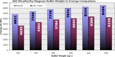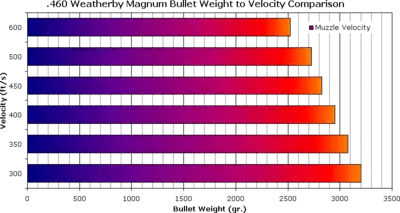 El .460 Weatheby Magnum lanza un proyectil de 500 granos (32 g) a una velocidad de salida de 2,700 pies por segundo (820 m/s) de un cañón de 26 pulgadas (660 mm), generando una energía de 8,100 libras.pie (11,000 J).[5]
