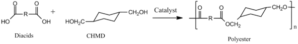 Los poliésteres termoplásticos que contienen 1,4-ciclohexanodimetanol presentan mayor consistencia, transparencia y resistencia a los disolventes. Las características exactas de los poliésteres varían desde el poli(tereftalato de 1,4-ciclohexilendimetileno) o PCT, cristalino y con elevado punto de fusión, hasta los copoliésteres no cristalinos que combinan etilenglicol y 1,4-ciclohexanodimetanol en su estructura. Las propiedades de estos poliésteres también dependen de la proporción cis/trans que posea el 1,4-ciclohexanodimetanol.[11] Este diol tiene un bajo punto de fusión y reduce el grado de cristalinidad del homopolímero de PET, mejorando su procesabilidad. Este factor hace que el polímero tienda a degradarse menos a acetaldehído y a otros productos de degradación no deseados.