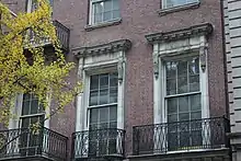 El segundo piso tiene cinco ventanas con paneles de seis sobre nueve. Sobre cada ventana del segundo piso hay un dintel y una cornisa de piedra modulada sostenida por ménsulas foliadas. Frente a cada ventana del segundo piso hay un balcón con una barandilla de hierro. La ventana central (correspondiente al pórtico) y la ventana más a la derecha (correspondiente a la entrada secundaria) tienen balcones más grandes que los otros tres vanos.[20][21] Estos balcones están diseñados como rombos alargados con rosetas en el centro.[20] El tercer y cuarto pisos tienen cada uno cinco ventanas con paneles de seis sobre seis, sobre los cuales hay dinteles de piedra extendidos. En el tercer piso, la ventana central tiene un balcón similar a los del segundo piso, mientras que las otras ventanas tienen alféizares simples de piedra caliza. Debajo del cuarto piso hay un marcapiano de piedra que funciona como alféizar de las ventanas del cuarto piso.[20][21] Sobre el cuarto piso hay una cornisa modulada, encima de la cual hay una balaustrada de piedra. El ático tiene un techo abuhardillado de pizarra con cinco ventanas abuhardilladas que contienen techos a cuatro aguas.[20][22] El techo abuhardillado también tiene tres chimeneas de ladrillo.[20]