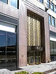 La torre está nivelada en tres lados, formando una estructura en forma de tarta nupcial. Los reveses retroceden en formaciones poco profundas de una gran plataforma de 16 plantas. Paneles de marco de granito rojo de amplio acristalamiento a nivel de la calle forman la base de piedra caliza de cinco plantas.[5]