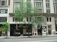 La base está compuesta por el primer y segundo piso. En la base, la tramo central tiene un pabellón de entrada ligeramente saliente revestido con bloques de piedra caliza rusticados y vermiculados.[12] Dentro de este pabellón de entrada es un arco con dovelas flanquean una voluta por encima de la parte superior del arco, y una puerta doble abordado desde una pequeña Stoop.[13] Un dosel de metal y vidrio, instalado en 2000, se extiende desde la entrada hasta la acera.[14] El resto de la base tiene escaparates o entradas a tiendas en el primer piso. La tramo ancha más occidental tiene una ventana de visualización de doble altura, mientras que las otras tramos del segundo piso tienen pares de ventanas de guillotina o ventanas rectangulares de varios paneles. Encima del segundo piso hay una cornisa de terracota saliente, que tiene un friso con círculos y triglifos alternos, así como un patrón de mutules que se alternan con rosetas o rombos en la parte inferior de la cornisa.[15]