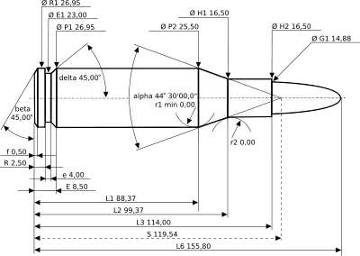 Para el sistema de medidas norteamericano, se define el ángulo de inclinación en alpha/2 ≈ 22,50 grados. La tasa de rotación común en el estriado de los cañones que la usan es de 455 mm (1 en 17.91 pulgadas), 8 giros, Ø espacios = 14,50 mm, Ø estrías = 14.95 mm.