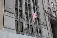 Un asta de bandera cuelga de la parte superior de la galería y dos más de la parte superior del segundo piso (el piso directamente encima de la galería). Los pisos intermedios en la calle 50 se tratan como subdivididos verticalmente en tres tramos, cada uno con un par de ventanas. Las ventanas de cada piso están separadas por enjutas con tracería gótica. El piso superior tiene arcos redondos apuntados y remates.[11]