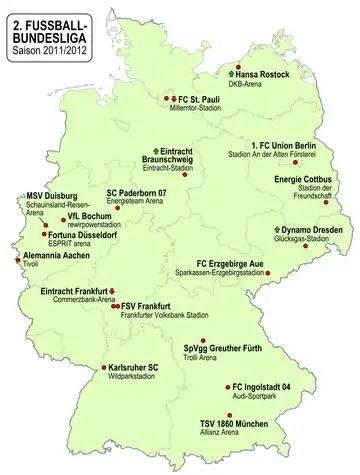 El torneo se disputa entre los meses de julio de 2011 y mayo del 2012. Al término de la temporada, los dos primeros clasificados ascenderán a la 1. Bundesliga, y el tercer clasificado disputará su ascenso con el antepenúltimo clasificado de la 1.Bundesliga. Los dos últimos descenderán a la 3. Liga y el antepenúltimo clasificado disputará su permanencia con el tercer clasificado de la 3. Liga.
