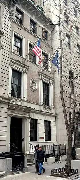 Las casas en 5-15 West 54th Street, construidas a fines de la década de 1890 para clientes adinerados, fueron diseñadas como una agrupación cohesionada, a diferencia de otras residencias en el vecindario.[11] Según The New York Times, estas forman la única "franja real de mansiones" que queda en Midtown Manhattan.[12] Las casas en 5, 7, 9-11 y 13 y 15 West 54th Street tenían arquitectos diferentes.[2][12] 5 West 54th Street fue diseñado por Robert Henderson Robertson en estilo neorrenacentista italiano.[2][9][13] Russell Sturgis, escribiendo para Architectural Record en 1900, describió la casa con un "frente marcadamente simple", considerando que el cartucho de piedra entre las ventanas del segundo piso no tenía "sentido" incluso cuando servía para centrar la fachada.[14]
