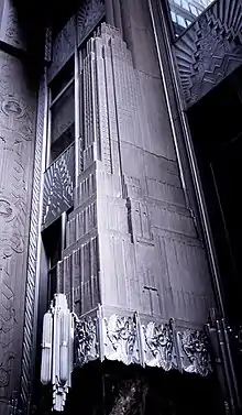 Hay 24 ascensores en total,[9] con seis grupos de cuatro ascensores cada uno en el vestíbulo del primer piso.[13] Había ocho ascensores de dos pisos; seis ascensores "exprés" que corrían sin parar desde el vestíbulo para dar servicio a los pisos superiores; ocho ascensores "locales" que daban servicio a los pisos inferiores; y dos montacargas. Todos los ascensores pudieron servir a un total de 10 200 personas cada hora.[28] En caso de emergencia, se estimó que, junto con las escaleras mecánicas que dan servicio a los pisos inferiores, estos podrían despejar el edificio en 35 minutos.[37] Las puertas del ascensor en el vestíbulo principal tienen un diseño ornamentado, que se asemejan a las del Fred F. French Building, el 608 Fifth Avenue, y al Edificio Chrysler. Cada puerta de ascensor es de doble hoja de aluminio, con patrones de rombos y tréboles, que fueron fundidos en una sola pieza. Las puertas de los ascensores en los vestíbulos tienen paneles en relieve octogonales esculpidos por Chambellan. Estos relieves muestran alternativamente a una mujer con una lámpara de aceite ya un hombre con una turbina eléctrica.[36][53]