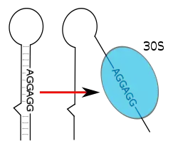 Los termómetros de ARN se encuentran en la 5'-UTR del ARN mensajero, corriente arriba del gen codificante para la proteína.[1] Allí son capaces de ocluir el sitio de unión al ribosoma (RBS) e impedir traducción del ARNm a proteína.[13] Cuando la temperatura aumenta, la estructura en horquilla pierde su integridad y expone el RBS o secuencia de Shine-Dalgarno, para permitir la unión de la subunidad ribosomal pequeña (30S), que a continuación recluta al resto de la maquinaria de traducción.[1] El codón de inicio, encontrado normalmente 8 nucleótidos corriente abajo de la secuencia Shine-Dalgarno,[13] señala el principio de la región codificante del gen que es traducido a proteína por el ribosoma. Además de este mecanismo regulador en cis, un caso de ARN termómetro regulador en trans ha sido encontrado en el ARNm de la proteína RpoS, donde se cree implicado en la respuesta a la inanición.[1]
