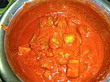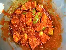 Ingredientes | Mango, aavalu (mostaza en polvo), ají rojo en polvo, sal y aceite, ajo y jengibre | |