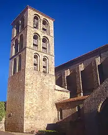 El transepto fue construido en el siglo XII, por debajo del coro, con dos campanarios, uno a cada lado flanqueados por absidiolas. Actualmente solo queda el de la zona sur, de tres pisos con arcos de medio punto sostenidos por capiteles románicos y merovingios.