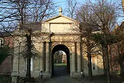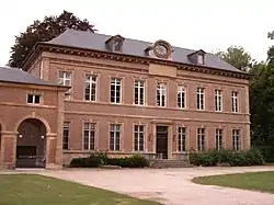 ![]() Antigua hospedería de la abadía, tras la que se aprecia el campanario de la iglesia de San Dionisio | ||
