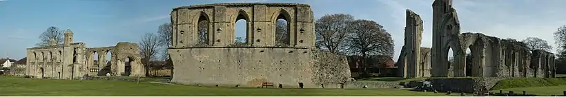 En el este de las columnas góticas del crucero todavía permanecen de pie las paredes del presbiterio y, detrás, la antigua capilla de Edgardo, mausoleo de los reyes sajones. El edificio de las cocinas del siglo XIV es lo único intacto. El edificio cuadrado está cubierto por un tejado de ocho aguas coronado por dos torres octagonales superpuestas que permitían la evacuación del humo.