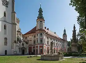 El edificio barroco del monasterio fue construido entre el año 1681 y el año 1702 y reconstruido en forma de cuadrilátero en la segunda mitad del siglo XIX. Construido alrededor de un patio rectangular con un ala sur que sobresale. Tres portadas barrocas conducen al interior de las 300 habitaciones: la portada de la corte con la figura de Temida, la portada del monasterio con San Benito y la portada de la abadía con el escudo del abad. En la planta baja hay un refectorio barroco, en el primer piso hay salas representativas: la sala del Príncipe, la sala de Púrpura, la sala del Roble y la sala Papal. La sala del Roble tiene un suelo de parqué con ricas incrustaciones y paneles de madera decorados con guirnaldas florales y frutales (todo ello realizado por tallistas de Henryków). La sala de Púrpura, destinada a la recepción de invitados distinguidos, tiene las paredes y la tapicería de los muebles de color púrpura, tiene también una chimenea de mármol. Contiene seis pinturas de Willmann que representan a los fundadores de la abadía. En el refectorio hay una cocina rococó multicolor (cada azulejo está pintado a mano) y bancos de roble del siglo XVIII. La capilla del seminario está decorada con paneles renacentistas.