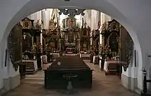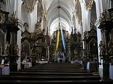 El altar mayor, obra de Georg Schroetter, fue creado entre los años 1681 y 1684. Está decorado con dos cuadros de Michael Willmann, el grande Boże narodzenie w wizji św. Bernarda y el superior Zbawca świata. El gran cuadro está rodeado a la izquierda por las estatuas de san Benito, san Juan Bautista y san Pedro, y a la derecha por las de san Bernardo, san Juan Evangelista y san Pablo. En el altar lateral hay una estatua de Virgen María con el Niño, llamada Matką Języka Polskiego (español: la Madre de la Lengua Polaca). Fue coronada con coronas episcopales en 1952.