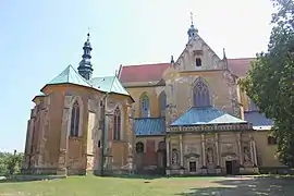La abadía medieval contaba con tres iglesias: la abacial (consagrada, según la tradición cisterciense, a la Virgen María) y dos iglesias parroquiales, consagradas, respectivamente, a Santiago el Mayor y a su hermano Juan el Apóstol. Aquí está enterrado el duque Boleslao I.[7]