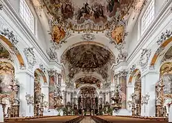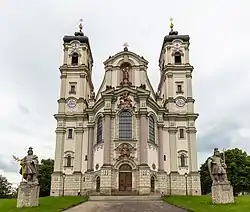 Es famosa por su basílica y biblioteca, consideradas joyas del barroco y rococó. Posee un magnífico órgano, uno de los mayores de Europa, construido por Karl Joseph Riepp (1710-1775).