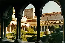 El claustro fue el primero de todos los claustros góticos del Rosellón. Fue construido por el abad Ramon Desbac a finales del siglo XIII; es de mármol procedente de Céret mientras que las columnas se construyeron con piedra traída desde Gerona. Tiene forma de cuadrilátero irregular y únicamente tiene pilares en sus ángulos. Una serie de arcos ojivales descasan sobre dobles columnas. Los capiteles tienen una decoración muy austera.