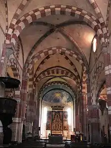 La visita de la abadía permite observar interesantes elementos de la arquitectura románica de la primera mitad del siglo XII y gótica de los siglos XIII-XV, elementos de las transformaciones de la época moderna (incluidos contrafuertes con arbotantes), edificios de actividad agrícola desde el siglo XVII. La iglesia, que esencialmente permanecerá en su forma románica, ofrece luego huellas conspicuas del arte gótico y renacentista internacional, del cual Bruno Ciliento y Guido Gentile han esbozado direcciones destacadas en las complejas historias que llevaron a curiosas reutilizaciones y dispersiones, en particular en las primeras décadas del siglo XIX, en la época del rey de Cerdeña Carlo Alberto di Savoia . Los edificios de la abadía tienen decoraciones escultóricas y relieves de mármol (claves, capiteles, cornisas) de los siglos XII-XIV, en particular en el claustro, en la iglesia y en la sala capitular. La iglesia tiene un exonártex del siglo XIV y una fachada renacentista superior con decoraciones en perspectiva: en el interior hay testimonios significativos del arte gótico tardío y renacentista, entre los que destacan principalmente el púlpito gótico tardío, una Crucifixión con San Juan y la Virgen esculpida en madera (hacia 1530, originalmente en el arquitrabe del pasaje de acceso al coro), la gran máquina del altar con las pinturas de Oddone Pascale ejecutadas alrededor de 1531-1533y esculturas de madera policromada, el altar del ábside izquierdo del siglo XVI, con retablo de madera de 1525, esculpido con elegantes candelabros renacentistas del escultor Agostino Nigra de Cavallermaggiore