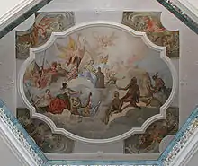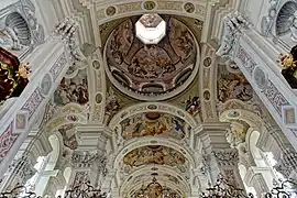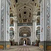 La conexión con la colegiata de Comburg también se muestra en el hecho de que el mismo yesero, Johann Bauer de Heidingsfeld (un lugar cerca de Würzburg), fue contratado para Schöntal, quien prefirió un lenguaje de diseño festivo y digno basado en el estuco de la catedral de Würzburg.[15] Solo los frescos del techo del coro, del crucero y de la cúpula corresponden a las pinturas que crearon a partir de 1724 el italiano Luca Antonio Colomba, el pintor de la corte de Württembergischer, con su asistente Giovanni Battista Ferrandini, que siguen las altas exigencias de la arquitectura y la decoración de estuco. Por otro lado, los otros cuadros, ejecutados por los pintores locales Konrad Hoffmann de Adelsheim y Christian Thalwitzer de Weikersheim, tienen menos inspiración, de la que puede ser responsable el propio abad Knittel, quien obviamente tenía un impulso irreprimible de agregar tantos aforismos como fuera posible que también eran símbolos de sí mismo.[16] En 1727, el interior de la iglesia del salón de tres naves estaba en gran parte completo y el abad Knittel pudo consagrar “su” iglesia, es decir, bendecirla y así usarla para el culto. La consagración solemne oficial del obispo de Würzburg, Johann Bernhard, tuvo lugar solo en 1736. La calidad de la arquitectura es igual, sin embargo, los altares con adornos rococó: sobre todo, el altar mayor extremadamente elegante de Johann Michael Fischer de Dillingen de 1773 con un retablo de igual calidad Asunción de María de Oswald Onghers de 1680 (basado en un modelo de Rubens), tomado del edificio anterior.[17] También de la antigua iglesia provienen varios altares renacentistas muy valiosos de Michael II Kern de Forchtenberg y figuras de Achilles Kern. Además, hay piezas de mobiliario de muchos otros artistas, entre ellos la caja del órgano finamente tallada de 1723, que solo se transfirió de la capilla del palacio de Ludwigsburg a una galería del coro alrededor de 1810.