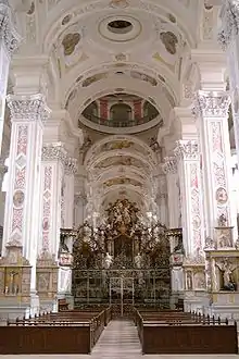 El abad Benedikt Knittel encargó al constructor Leonhard Dientzenhofer que planificara una nueva iglesia para la abadía. El 2 de abril de 1707 se concluyó el contrato de la nave como primera fase.[8] Dientzenhofer murió en noviembre de 1707 antes de que comenzara la construcción. Un cuñado de Schwipp y Palier Dientzenhofer, el albañil y maestro artesano Jacob Ströhlein,[9] pudieron entonces comenzar el nuevo edificio en la primavera de 1708 según los planos de Dientzenhofer.