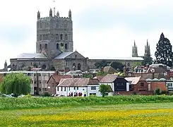La ciudad de mercado de Tewkesbury se desarrolló al norte de los recintos de la abadía, de los cuales quedan vestigios en el trazado de las calles y unos pocos edificios: la casa de entrada del Abad, el granero de Almonry, el molino de la abadía, la casa abacial, la actual vicaría y algunas viviendas de entramado de madera en la Church Street. La abadía ahora se encuentra parcialmente aislada en el césped, como una catedral en su recintol, ya que el área que rodea a la abadía está protegida del desarrollo por el Abbey Lawn Trust, originalmente financiada por un benefactor de los Estados Unidos en 1962.[34]