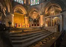 Entre el santuario y el ambulatorio se encuentran tumbas y capillas monumentales, que forman grandes losas que se elevan hasta las bóvedas de las grandes arcadas del coro, especialmente la de sir Guy de Brien. Una "cantoria" (chantry, capilla funeraria cerrada) de 1397 está dedicada al fundador, Robert FitzHamon, abad en 1102.