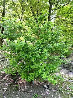 Caducifolio o semicaducifolio, de tallo rojizo, los jóvenes cubiertos de una leve pubescencia de ese mismo color. Hojas ovadas, con los márgenes ligeramente dentados, de color verde claro brillante que se tornan moradas en otoño, agudas, de base atenuada o redondeada, de 2,4-4 × 1-3 cm. Pequeñas flores durante el verano y principios del otoño, de olor suave, distribuidas en pequeñas panículas blancas, dispuestas normalmente en pares sobre cada pedúnculo. Cáliz con 5 sépalos, oblanceolados,[1] ligeramente tomentosos,[2] de unos 6 mm de largo, rosa pálido que permanece bastante tiempo después de la caída de la flor. Corola en forma de embudo, de unos 12 mm de longitud, de color blanco o con tintes rosados. Los estambres y carpelo sobresalen a la corola.