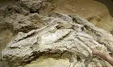 - Depósitos de rocas caídas, compuestos por grandes bloques y gravas de travertino de cornisa y pared con arenas y limos calcíticos. Estos fragmentos de roca tienen relación con la meteorización, es decir, por la fragmentación mecánica y la disgregación granular, de la pared y visera del abrigo.