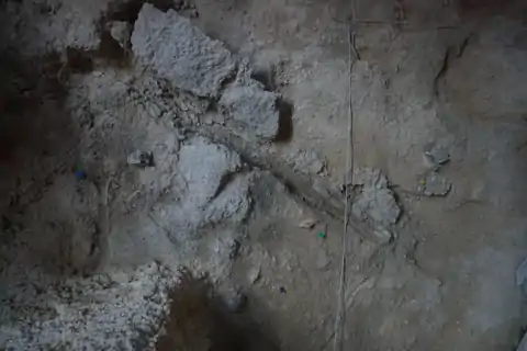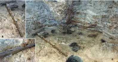 Entre los hallazgos se encuentra el negativo de una pieza larga de madera, de unos 5 m de largo y un grosor de 6 cm en un extremo y 3 cm en el otro, con una antigüedad superior a los 55 000 años, que se ha identificado como una rama de un pino empleada para construir una cabaña dentro del abrigo.