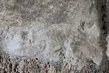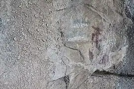 - Escena con tres cuadrúpedos pintados en negro encima de una capa blanquecina. Sobre uno de ellos se superpone una figura humana en color rojo con los brazos en aspa.