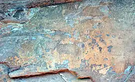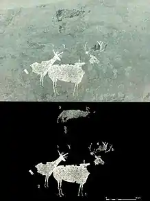 ![]() Detalle de panel decorado (cérvidos estáticos: natural) en el Abrigo del Prao Medias, Rodeno de Tormón, Parque Cultural de Albarracín (2018). | ||