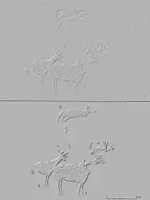 Motivo 2: Ciervo macho adulto orientado a la derecha (en color rojo oscuro), parcialmente superpuesto al Motivo 1: se conserva solo la parte delantera del animal (cabeza, orejas, astas), cuello estilizado sin efectos de repintado.