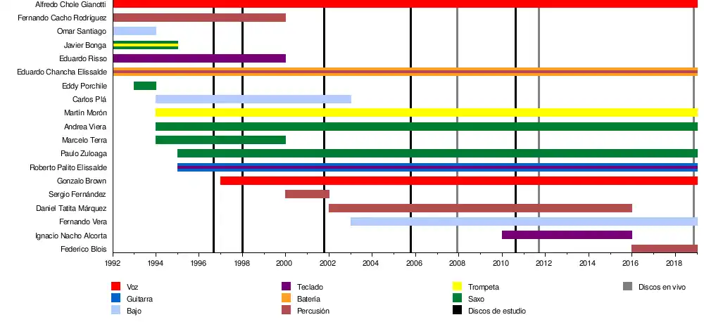 Fue formada principalmente por los vocalistas Alfredo "Chole" Gianotti y Gonzalo Brown, el guitarrista y tecladista Roberto Elissalde, el bajista Fernando Vera, el baterista y percusionista Eduardo Elissalde, los saxofonistas Paulo Zuloaga y Andrea Viera, entre otros.[3]