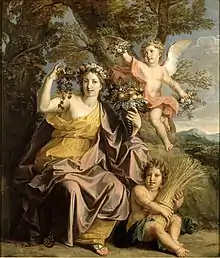Abundancia es una divinidad alegórica que Ovidio dice que siguió a Saturno cuando Júpiter le destronó. No tenía entre los antiguos ni templo, ni altar determinado. La pintan bajo la figura de una ninfa joven, robusta y de colores vivos, ceñida la trente con una guirnalda de varias flores y con vestidos de color verde recamados de oro. Lleva en la mano derecha el cuerno de Amaltea y en la izquierda un manojo de espigas, que caen en desorden. En una medalla de Trajano está representada con dos cuernos en lugar de uno. En otra de Antonino se la ve en pie con las manos entendidas sobre canastos llenos de flores y de frutas. Algunas veces se halla indicada por Ops o Ceres. En una medalla de Pertinax tiene dos espigas en la mano derecha y con la izquierda sostiene su ropaje que está algo separado de su pecho, para manifestar mejor su seno, indicando de este modo el manantial de todas las riquezas.